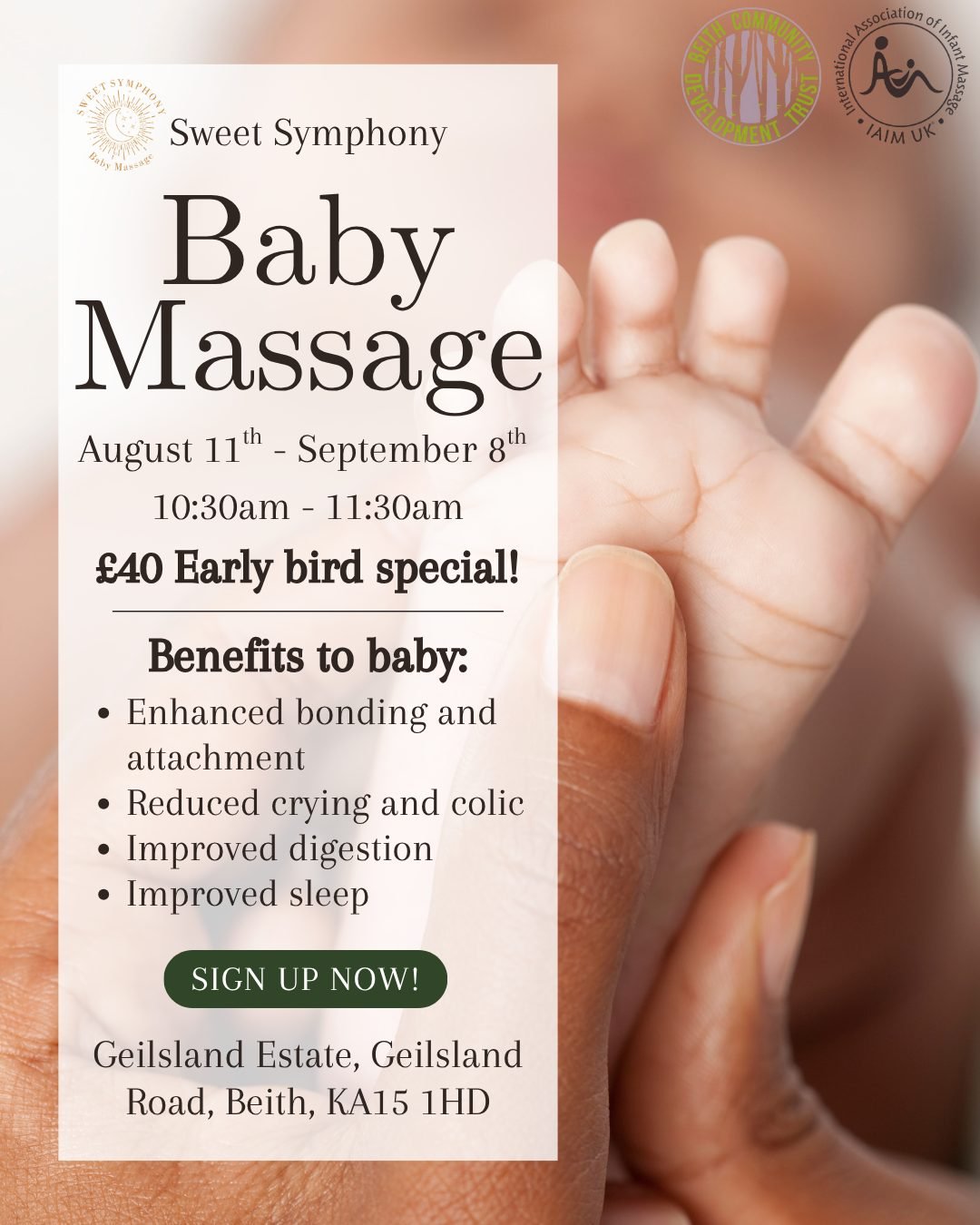 Join us for a calming and nurturing five-week Baby Massage Course facilitated by Sweet Symphony, running every Monday from August 11th to September 8th from 10:30am–11:30am at Geilsland Estate, Geilsland Road, Beith, KA15 1HD. This course is perfect for parents with babies aged newborn to crawling, offering gentle, expert-led techniques that support: and also provide […]