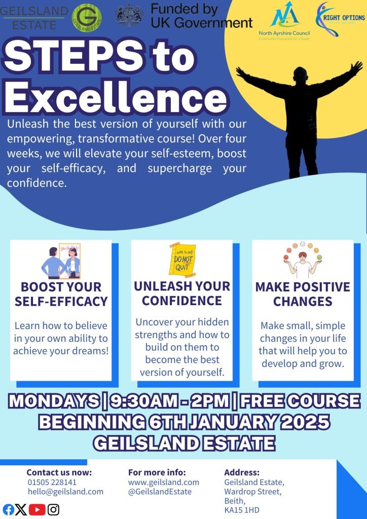 Starting on Monday, 23rd September, Beith Trust is offering a free 4-week self-confidence building course, running from 9:30am to 2pm. This course is designed to help you build on your existing strengths, boost your confidence, and equip you with the tools to become the best version of yourself.